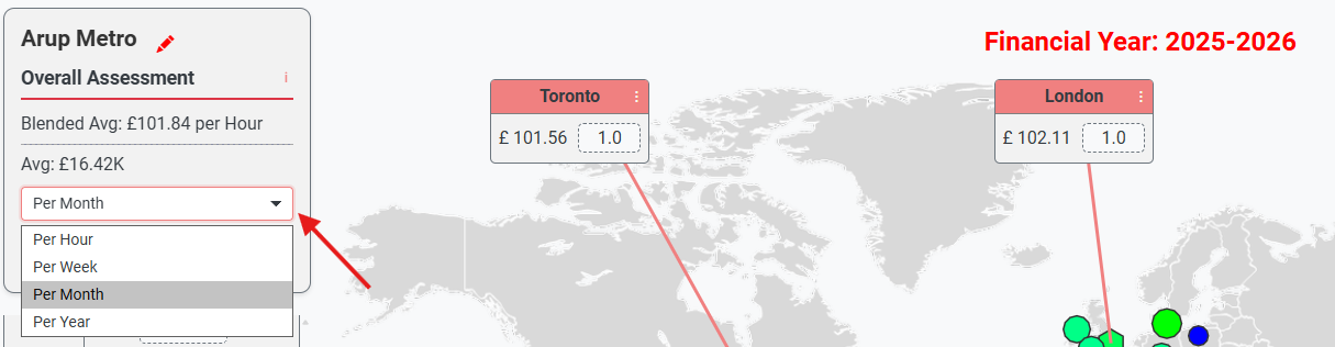 from that location. The system automatically calculate the blended average hourly rate. For example, a 50:50 split between London and Toronto would be entered as shown. The blended rate is: (1 * £102.11 + 1 * £101.56)/(1 + 1) = £101.84 per hour, as shown in the top-left summary panel.