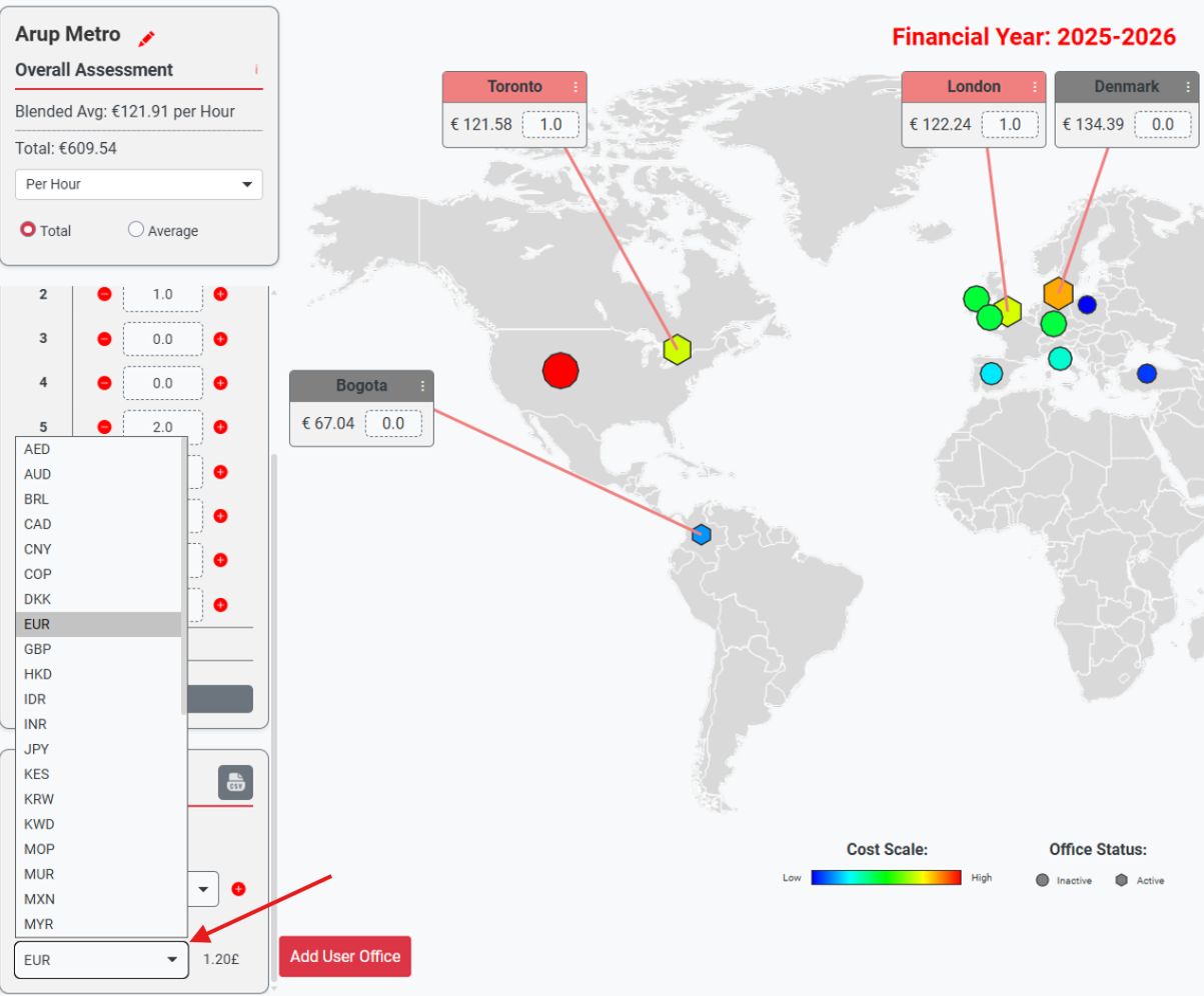 Use the currency selector to change the display currency at any stage of modelling. Office rates and blended rates are recalculated and presented in the selected currency, enabling clear comparison of project cost scenarios across different markets.