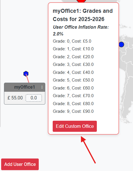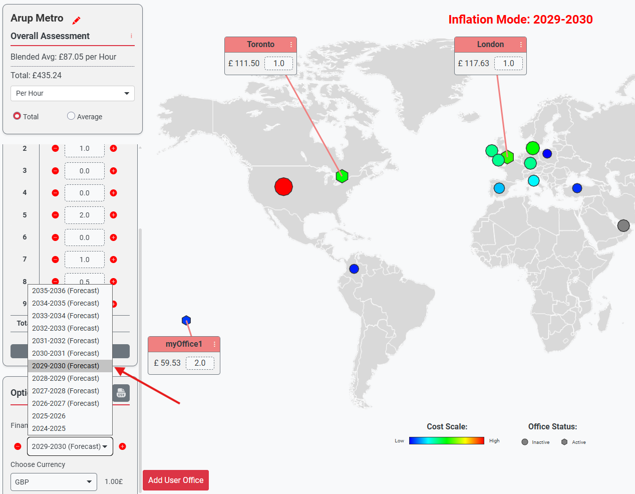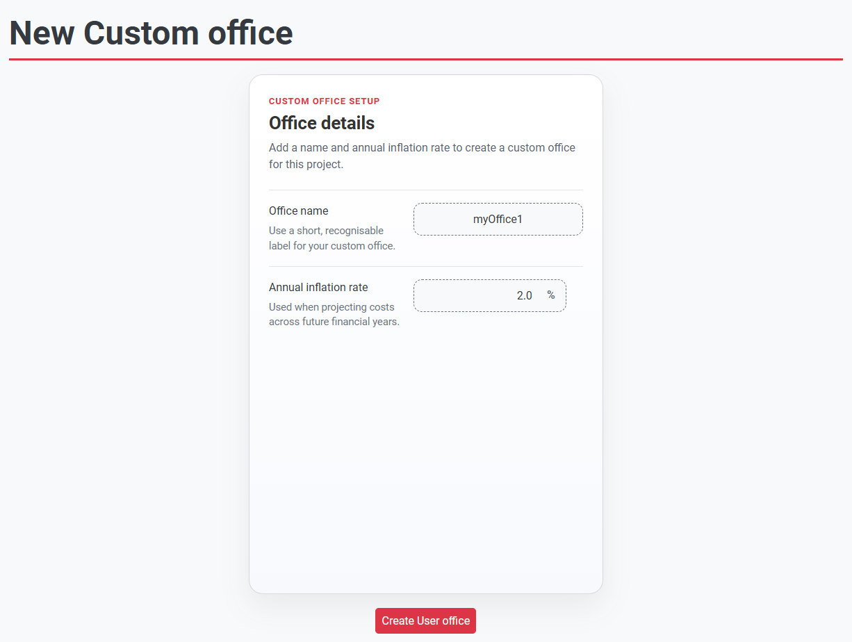 Use the Add User Office option to create a project-specific office when your scenario is not fully covered by standard office data. Enter and update grade costs for the relevant financial year, then set the office inflation rate to align future-year forecasts with your planning assumptions.