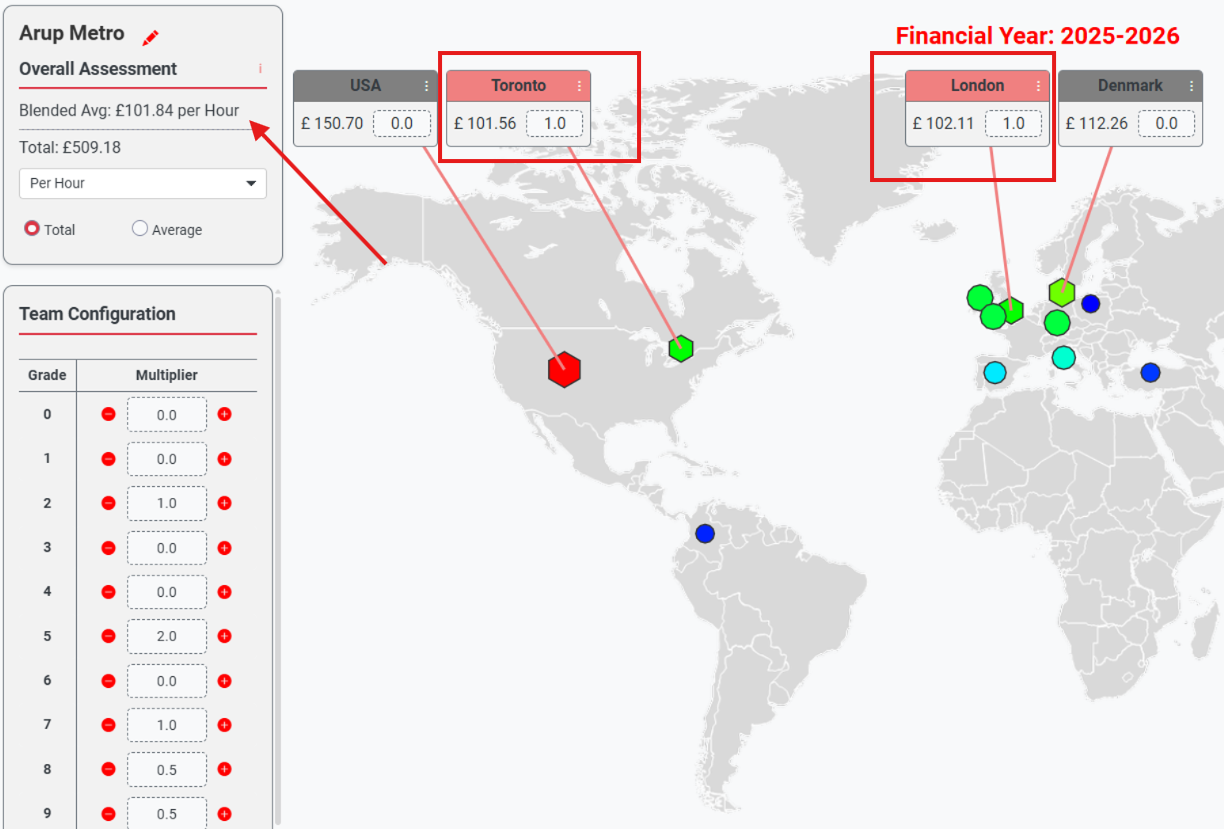 Team Blender is a web application created in 2024 to compare the cost of work by different Arup office production centres. The tool enables users to build a team by grade and see the average hourly cost of a team with that grade structure in different offices. Users can then specify the percentage contribution of each office, and the tool calculates the overall hourly average rate.