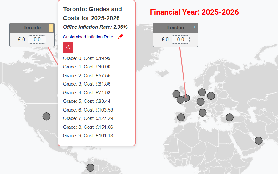Choose the office locations you want to include in your project team. You can view offices on an interactive world map and see detailed information about each location including region and available staff rates. Click on the three-dot menu next to any office name to view grade costs for that location.